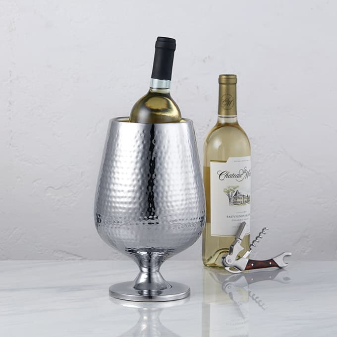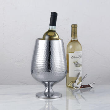 This stainless steel wine cooler features an elegant hammered design and double walls to keep bottles colder for longer. With a 54 oz. capacity, it can also serve as a shareable drinking vessel for crowd-pleasing cocktails
