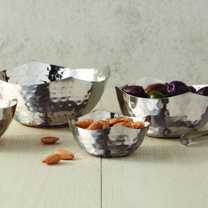 Pair stainless steel with cutting-edge shapes, and you get some of the most contemporary serving bowls on the market. Available in numerous sizes and different finishes; you have the perfectly sized bowl for a number of different uses. Whether you need a bowl for peanuts at the bar or you need one to present fruits at the front desk, you’ll find exactly what you need in these fantastic snack bowls.