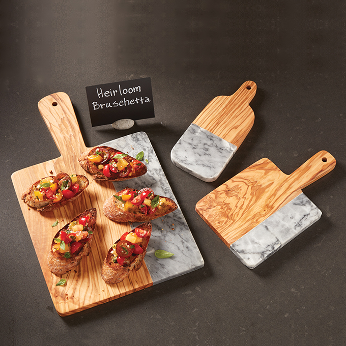 These olive wood boards and peels feature rich patterns, earthy looks and unique handle designs. Combining cool marble and natural wood will give your display dimension and originality. From charcuterie to single serving sandwiches, there’s a size for every need.