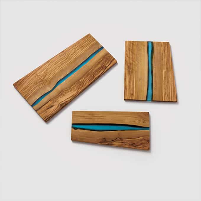 A jaw-dropping way to serve hors d’oeuvres and charcuteries. These high-end, food-safe serving boards infuse stunning olive wood with a streak of vibrant blue polyresin.