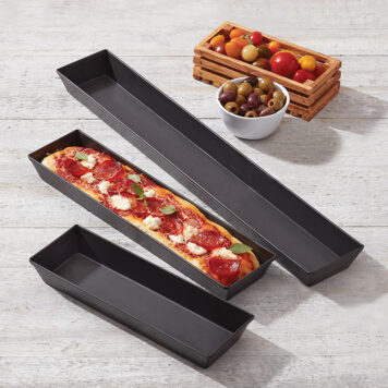 Everyone deserves to enjoy your delicious pizza crust. That’s why we’ve created these rectangular long pans! Available in 12″, 16″, and 24″ lengths, these skinny pans allow you to create 3-6 equal 4″-wide cuts where each slice includes 2-3 sides of your tasty pizza crust. No crustless inside pieces here! These pans are a fun twist on standard Detroit-style pans, catering to settings where pizza is served by the slice. We recommend these long pans for business cafeterias and school dining halls. Manufactured of heavy-duty hard coat aluminum, these pans are reliable in commercial kitchens where efficient cooking, easy clean-up, and durability are of the essence.