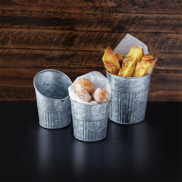 With a French Bistro look, these fry cups are ready for anything. You can even use them as elegant little trash receptacles. Not for use with acidic foods.