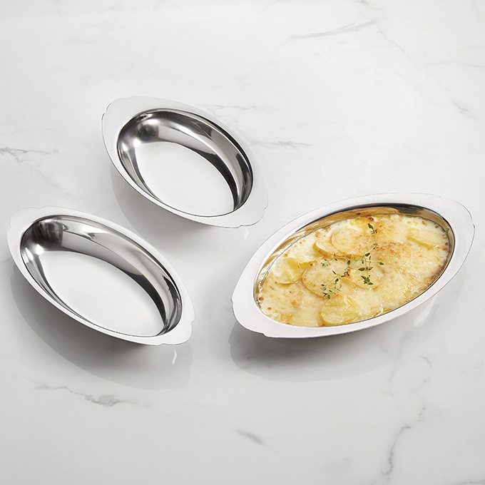 Add flair to your display by switching out porcelain for these more unique (and durable) stainless steel au gratin dishes! Available in various sizes, these serving dishes feature a timeless design. Create a classic plate for your culinary creations!