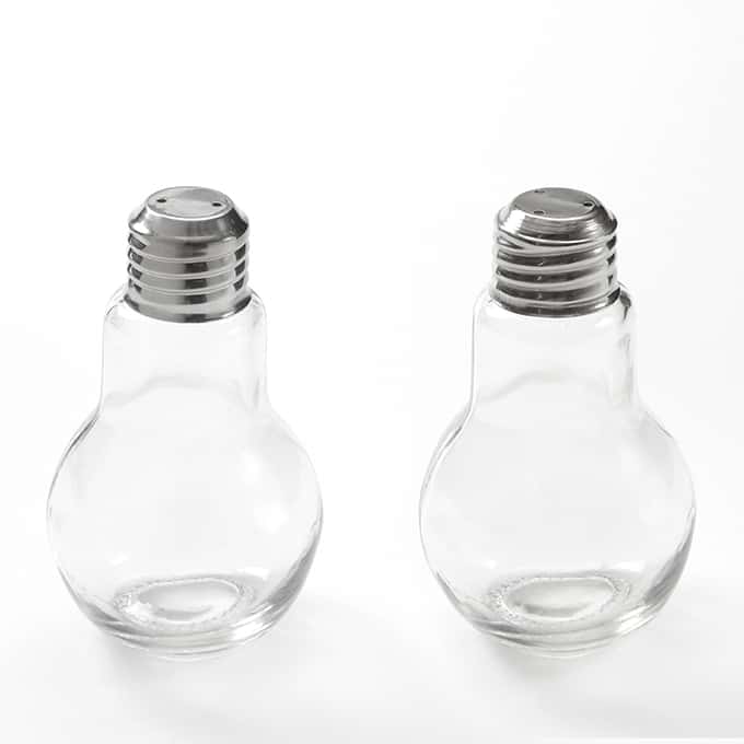 Talk about a great idea! These lightbulb shaker sets are available in multiple sizes and feature stainless steel caps.