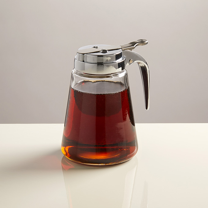 With this contemporary design, this durable glass syrup dispenser is a great addition to any tabletop. Featuring an easy-pour lever and screw-on top, this dispenser efficiently serves your syrup, honey, and dressings. Replacement top available separately.