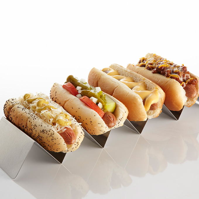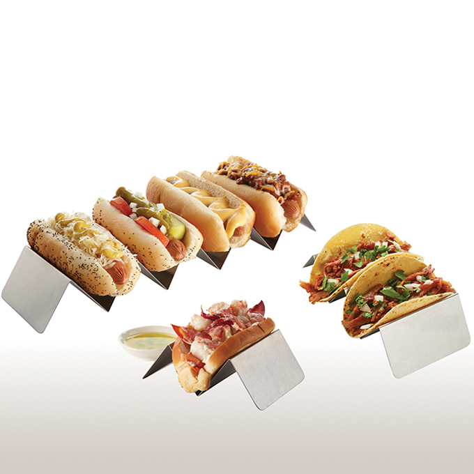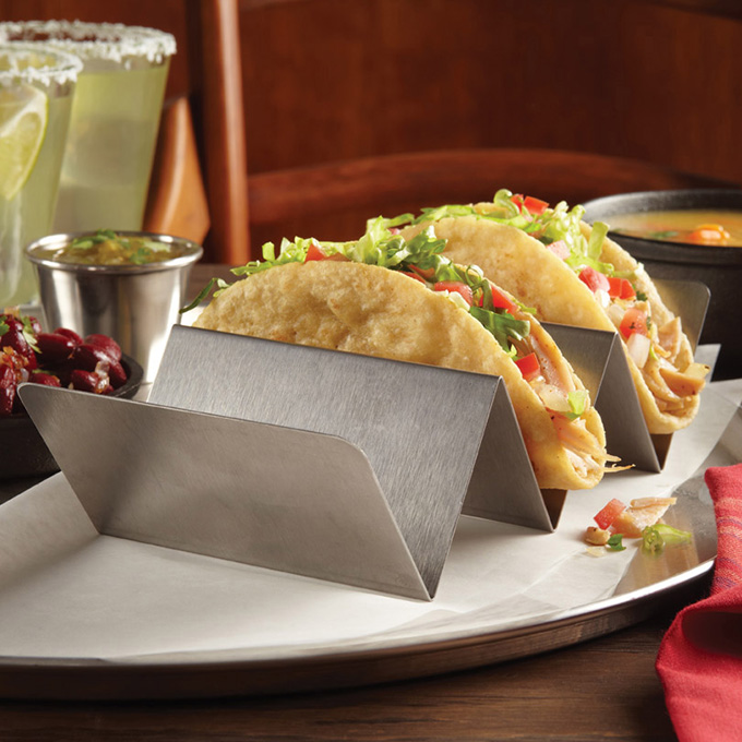 Taco Holders: Manufactured in a brushed stainless steel, these taco holders make great presentations. Invert each one to add another serving slot option. They’re versatile!