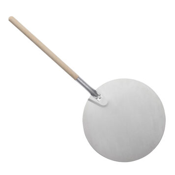 With a diameter of 16″, this round aluminum peel with wood handle is perfect for sliding large pizzas in and out of the oven. Measuring at an overall length of 38″, this peel keeps your hands outside of the hottest parts of the oven and safe from burns. This means you can place food further back into the oven than if you were to use your hands alone. The thin blade slips smoothly under pizzas and helps maintain the delicate structure of the dough during transfers. The wooden handle offers a secure, comfortable grip and adds a rustic, authentic aesthetic. Designed with versatility in mind, this peel also conveniently functions as a cutting and serving board. The blade’s high-quality, durable aluminum is resistant to corrosion and wear, so it will remain intact for years on end. Use this peel at your pizzeria, restaurant, or hotel kitchen. Made in the US. Hand wash only using aluminum-safe detergent. Note: aluminum blade can be perforated to reduce resistance and weight.