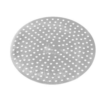 With a diameter of 16″, this perforated disk is your golden ticket to perfectly golden pizza crust. Constructed of 18 gauge, 1 mm standard-weight aluminum, this disk transfers heat more quickly and evenly compared to stainless steel pans. The 3/8″ perforations allow for more air circulation for that flawlessly crisp crust all the way throughout. Best of all, this disk features unfinished edges that serve as a dough cutter for consistently-sized pizzas. The high-quality, durable aluminum is rust, corrosion, and warping resistant, so it will remain intact for years on end. Use this disk at your pizzeria, restaurant, diner, or hotel kitchen. Made in the US. Hand wash only using aluminum-safe detergent.
