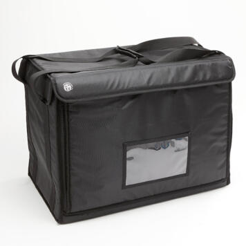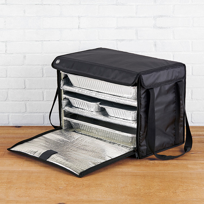 With its durable polyester construction and reinforced stitching, this deluxe black catering delivery bag is the prime solution for delivering pastas, salads and other family-style feasts. Measuring at a length of 22″, width of 13″, and height of 16″, it can fit 3 full or 6 half-size food pans. It also includes adjustable shelves and a reinforced frame to provide support for your to-go containers. Most importantly, its 5 mm polyethylene-insulated lining with foil finish and secure hook-and-loop closure ensure maximum heat or cold retention. Your customers will be able to enjoy exceptional food no matter the delivery distance. The 2″ wide carrying straps offer comfort and help keep containers and boxes upright, while the easy zip front-loading flap allows for quick food transfer. The multifunctional transparent signage window can serve as a display for your company’s logo, or as a compartment for business cards and coupons. Designed with convenience in mind, this satchel is easy to clean and compactly folds for space-saving storage. It is also resistant to abrasions, mildew, and fading so you can use it at your pizzeria or restaurant for years on end!