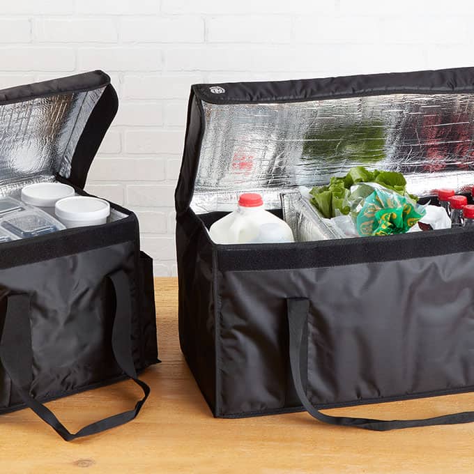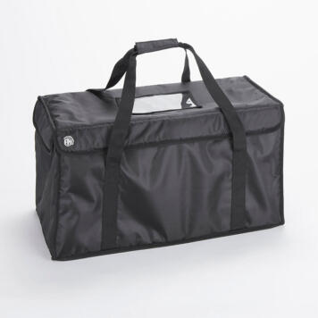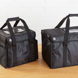 With its durable polyester construction and reinforced stitching, this deluxe black delivery bag is the key to customer satisfaction. Measuring at a length of 24-3/4″, width of 12-1/2″, and height of 12″, this top loading bag can hold various to-go items. It’s perfect for transporting carry out containers with sandwiches, pizzas, pastas, salads, fries, desserts, and more. You can even use it for grocery deliveries – made easy with the included movable partition. The 5 mm polyethylene-insulated lining with foil finish and secure hook-and-loop strip closures ensure maximum heat or cold retention. Your customers will be able to enjoy exceptional food no matter the delivery distance. The rust-proof iron grommet ventilation holes let the bag breathe, preventing condensation. The 2″ wide carrying straps offer comfort and help keep containers and boxes upright. The multifunctional transparent signage window can serve as a display for your company’s logo, or as a compartment for business cards and coupons. Designed with convenience in mind, this bag is easy to clean and compactly folds for space-saving storage. It is also resistant to abrasions and mildew, so you can use it at your pizzeria or restaurant for years on end!