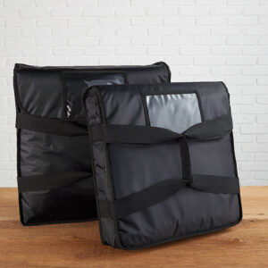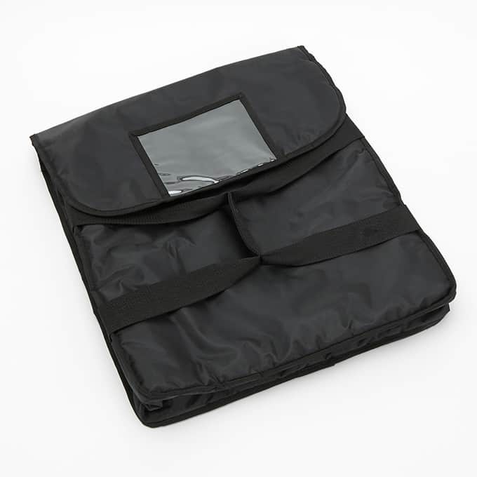 With its durable polyester construction and reinforced stitching, this deluxe black pizza delivery bag is the key to customer satisfaction. Measuring at a length/width of 20″ and height of 5″, this bag can hold two extra-large 18″ pizza boxes or multiple smaller boxes at a time. The thick, foil-covered insulation and secure hook-and-loop strip closures keep pies oven fresh, so your customers can enjoy hot, exceptional pizza no matter the delivery distance. The built-in ventilation holes prevent condensation, ensuring that pizza crusts remain perfectly crisp. The comfortable crossing carrying straps and easy-open side flap allow you to stably transport the pizzas, keeping them horizontal and intact. The multifunctional transparent signage window can serve as a display for your company’s logo or a pocket for menus, coupons, and business cards. Designed with convenience in mind, this bag is easy to clean and compactly folds for space-saving storage. It is also resistant to abrasions and mildew, so you can use it at your pizzeria or restaurant for years on end!