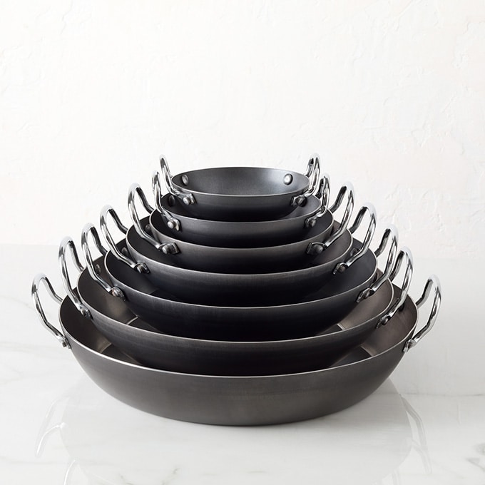 These paella pans are sure to be crowd pleasers – hosts and guests alike, thanks to the range of sizes. Made of black steel, these pans can withstand high heat either from the oven, broiler or induction burner. Perfect for oven-to-table entrées, individual portions or sides.