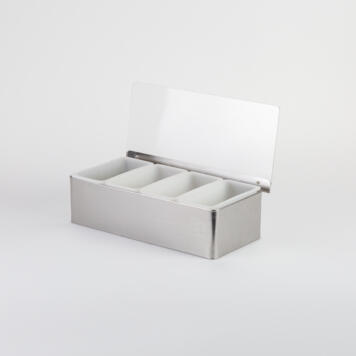 This 12″ L x 5-3/4″ W x 3-1/2″ H condiment holder has a stunning satin-finish stainless steel exterior, clear lid, and 4 white compartments. Store four different condiments or garnishes to create an attractive, organized bar setup. With a clear lid that protects your food from germs and allows you to show off what’s inside, this holder is both functional and fashionable. Pair it with more of our satin-finish stainless steel table and bar accessories to create a cohesive presentation!