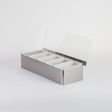 This 14-3/4″ L x 5-3/4″ W x 3-1/2″ H condiment holder features a gorgeous satin-finish stainless steel exterior with five white compartments for condiments, garnishes, toppings and more. The clear lid keeps food protected, and lets you prominently display a colorful array of condiments. Keep your tabletops, counters, and bar organized with this simple, chic bit of storage! Pair it with more of our satin-finish stainless steel table and bar accessories to pull together your entire aesthetic.
