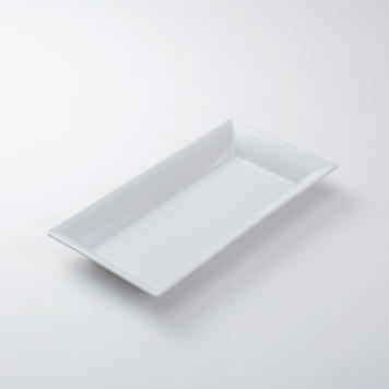 You will never run out of ways to use this 18-1/4″ L x 9-1/4″ W white ceramic platter. Its size is versatile enough to be the backdrop for a beautiful entrée, shareable appetizers, a variety of hors d’oeuvres, sushi, or an array of desserts. It has raised edges that will keep food and sauces secure. Pair with our compatible display stands to create an elaborate, dynamic showcase.