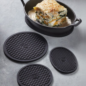 Leave your guests satisfied in more ways than one with this 8-1/2″ L x 6″ W pre-seasoned cast iron oval casserole dish! It won’t just deliver on its rustic aesthetic – it’s also the perfect way to bake a casserole and serve straight from the oven. Pair it with our heat-resistant black trivet to serve!
