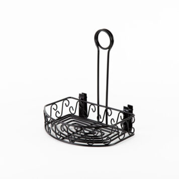 Dress up your tabletop with this attractive wrought iron 8-1/4″ L x 6-1/4″ W semi-round caddy! It has a scroll design that adds a subtle touch of elegance. Featuring a card holder for numbers and specials menus, this piece truly has everything.
