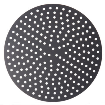 These perforated disks will bake 5-star pizzas that simply cannot be beat! Unlike solid pans, our Perf disks feature 3/8″ holes that allow for extra air circulation. Your customers will be able to enjoy flawlessly crisp, golden pizza crust all the way throughout! These versatile disks are also designed with unfinished edges, so you can use them as dough cutters for consistently-sized pizzas. Choose from a wide array of diameter sizes in either 18 gauge, 1 mm standard-weight aluminum or 18 gauge, 1.5 mm hard coat anodized aluminum.