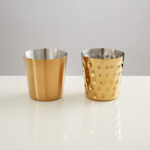 Bring your tabletop into total elegance with this gold-finish stainless steel 3-3/8″ DIA. x 3-3/8″ H fry cup! The simple, sleek design highlights the gold finish, which makes your food shine too. With a capacity of 14 ounces, you have ample space to satisfy your guests. Pair it with our gold laser cut platter to create a simple, yet sophisticated finished look.