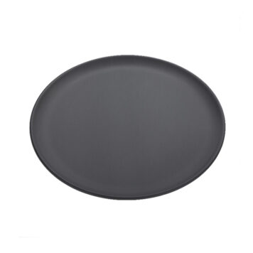 With an outside diameter of 13″ and inside diameter of 11″, this round coupe-style pan is a staple for baking and serving thin crust pizzas. Constructed of 14 gauge, 1.5 mm thick, dark-colored hard coat anodized aluminum, this pan heats more quickly, evenly, and to a higher temperature compared to the standard aluminum pan. The non-reactive oxide coating safely cooks acidic ingredients, so you can maintain the integrity of the taste and color of your pizza sauces. The smooth, flat bottom functions as both a baking pan and a serving platter, reducing the amount of dishes you need to wash. The slightly curved rim keeps your pizza in place, ensuring that it does not slide when transferring in and out of the oven or when transporting to your patrons. This pan’s high-quality, durable aluminum is resistant to corrosion and wear, so it will remain intact for years on end. Best of all, it easily stacks for space-saving storage. Use this pan at your pizzeria, restaurant, diner, bakery, or hotel kitchen. Made in the US. Hand wash only using aluminum-safe detergent.