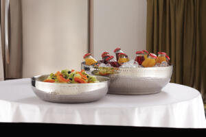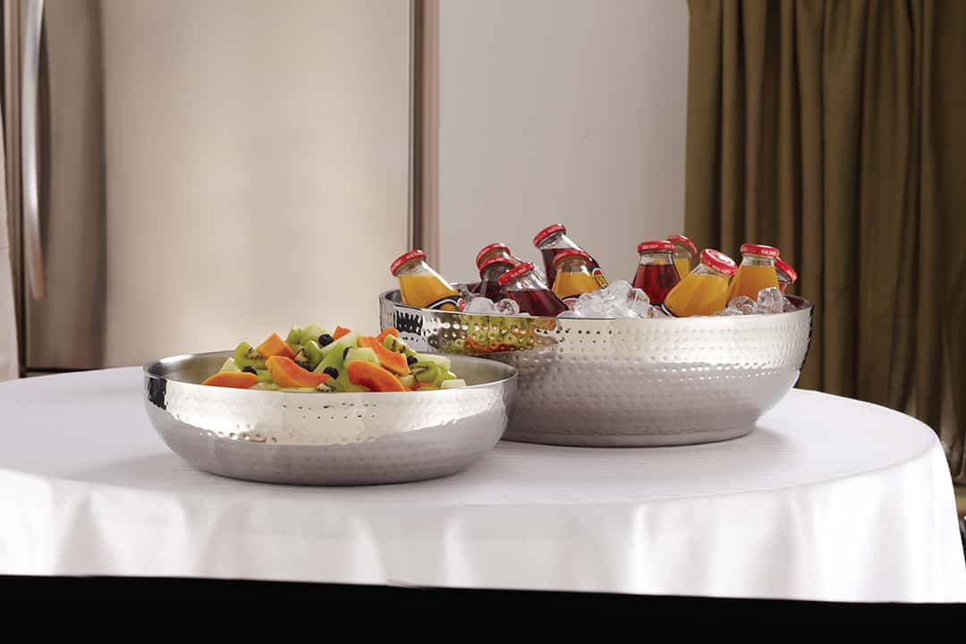 Featuring double wall insulation, this trendy 14-3/8″ diameter durable hammered stainless steel bowl will keep hot food hot and cold food cold, without the outside sweating or getting too hot. With a capacity of 250 ounces, this bowl can display beverages on ice, family servings of salad, or fresh produce in a radiant style. With a classic bowed shape, this bowl combines the chic with the traditional – a look perfect for buffets, catered events or parties that want to stun their guests. Pair with our hammered buffetware for an elegant, cohesive look.