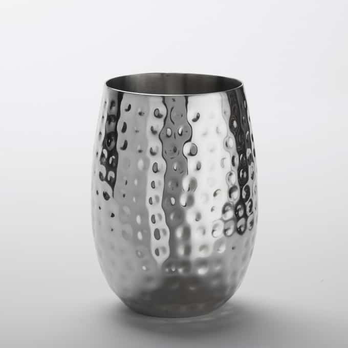Make a splash at the bar with these hammered, mirrored-finish stainless steel designs in three different colors.