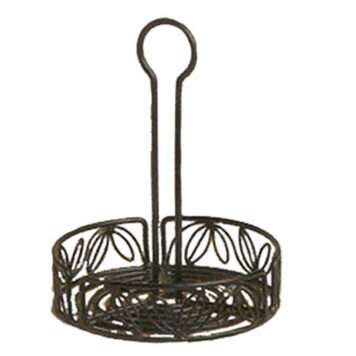 Bring modern flair to the table with this 7-3/4″ DIA. wrought iron condiment caddy! It has an attractive leaf design that combines well with the sleek black finish. And it’s designed with a 9″ H card holder in the center, so you can display menus and number cards without taking up more table space. Pair it with a set of our glass shakers to set your tables up for success!