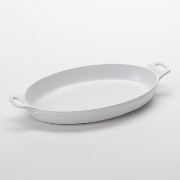 This 8-1/4″ L x 5-1/2″ W x 1-1/2″ H oval melamine faux cast iron casserole serving dish is an ideal way to serve entrées or appetizers. It’s crafted from dishwasher-safe and durable melamine, making it an ideal choice for busy environments. Best of all, the white backdrop will allow your food to stand out easily, giving your presentation that extra boost. Pair it with serving boards from our Melamine Naturals collection for a classic look!
