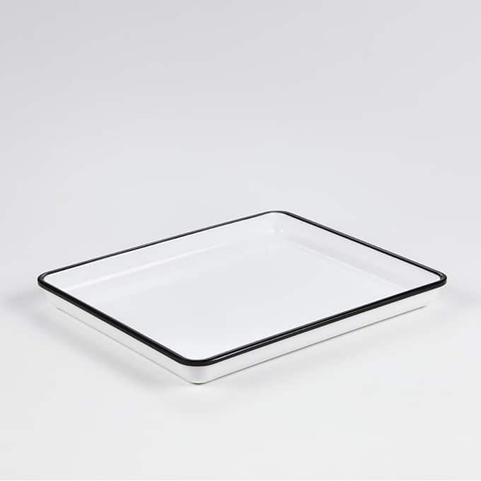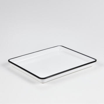 Serve an entree, side, and drink on this 12-7/8″ L x 10-1/4″ W bold black-rimmed white melamine serving tray. Featuring 1-1/8″ high sides, this tray will stylishly hold baked goods or sides for a buffet line, or keep food easily contained during kitchen to table service. Create a dynamic, geometric display by pairing this black-rimmed tray with trays of different sizes. Not recommended for microwave use.