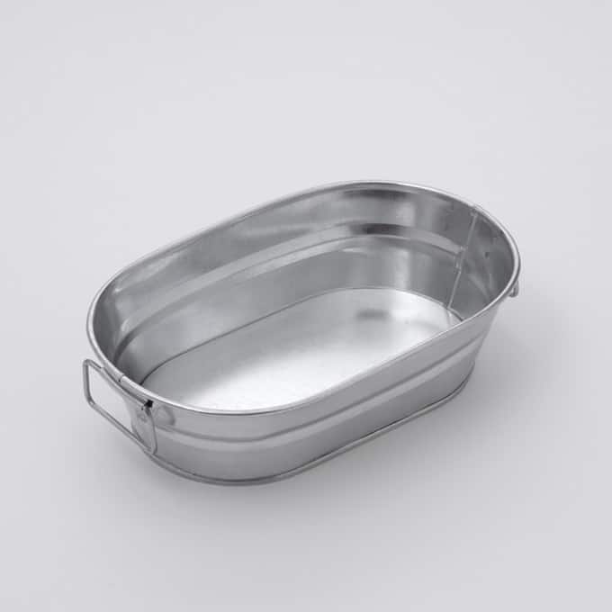 At 8-3/4″ L x 5-1/8″ W, this oval galvanized metal tub is perfect for serving a baguette or a sandwich, or storing sweeteners, shakers and condiments at the table! The galvanized metal construction is durable and attractive, with handles that make it perfect for a busy catered event or venue. Couple it with a pair of our glass shakers to finish the look!