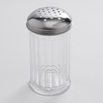 With a capacity of 12 ounces (355 mL), this plastic cheese shaker with perforated stainless steel lid is the perfect dispenser for grated cheese and spices. Its straight fluted exterior offers a classic touch to any tabletop. The crystal clear body allows your guests to easily identify the shaker’s contents and for staff to see the amount remaining. When it is time for a refill, simply unscrew the practical metal top. Measuring at a height of 5-3/8 inches and a diameter of 3 inches, it is the ideal size for storage or fitting into a carrying caddy. Use this shaker at your pizzeria, restaurant, diner, hotel, or catered event. Designed with convenience in mind, this jar is dishwasher safe for easy handling. It is both break resistant and BPA free.