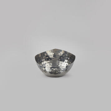 Stun guests with this glossy hammered stainless steel 4″ diameter squound bowl. It’s the ideal size for serving condiments, sauces, nuts or desserts. Best of all, the glistening hammered design will hide scratches or fingerprints that collect over time, leaving it looking just as alluring as it did the first time you used it. Create a unique tabletop by pairing this bowl with the hammered squound bowls in other sizes.