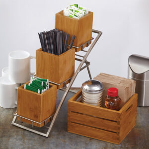 You can give your tabletops a trendy boost by storing condiment packets, stirrers, flatware and more in this attractive 3-7/8″ square bamboo caddy. Bamboo is durable, lightweight, and looks fantastic. Pair with our compatible racks and stands, like TASSM to store everything you need.